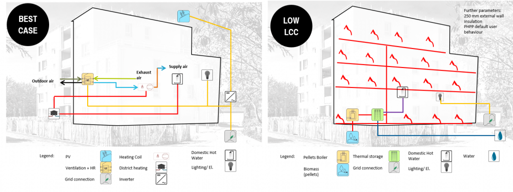 The analysis of the variants with the highest and lowest NPV as well as the ones with the highest and lowest CO2 emissions based on the parametric analysis conducted in WP06 shows that non-technical factors have a strong influence on the energy demand, emissions and NPV of a building. These are (amongst others) the user behaviour and climate conditions. Furthermore, a building envelope at least having a nZEB standard – in many cases even a higher standard – is an important component of low emission and low-cost buildings. In these buildings, DHW is in most cases dominating the final energy demand. An interesting finding of analyzing the variants with the lowest NPV and lowest emissions is that in most cases these variants have less technical installations than the base cases and can be considered as low tech buildings. Minimizing the technical installations is, on the one hand, reducing the investment as well as operation and maintenance cost and on the other hand minimizes the auxiliary energy demand. Furthermore, the active use of solar energy (mainly PV, in several cases, also solar thermal) is essential for achieving minimal CO2 emissions. Solar technologies are often competitive with other technologies and especially in the case of PV, which has positive effects on the costs/ NPV. From the analysis, possible best solutions achieving low emissions with comparably low costs were identified. As an example, possible best variants of the case study Résidence Alizari are shown in the Table below.