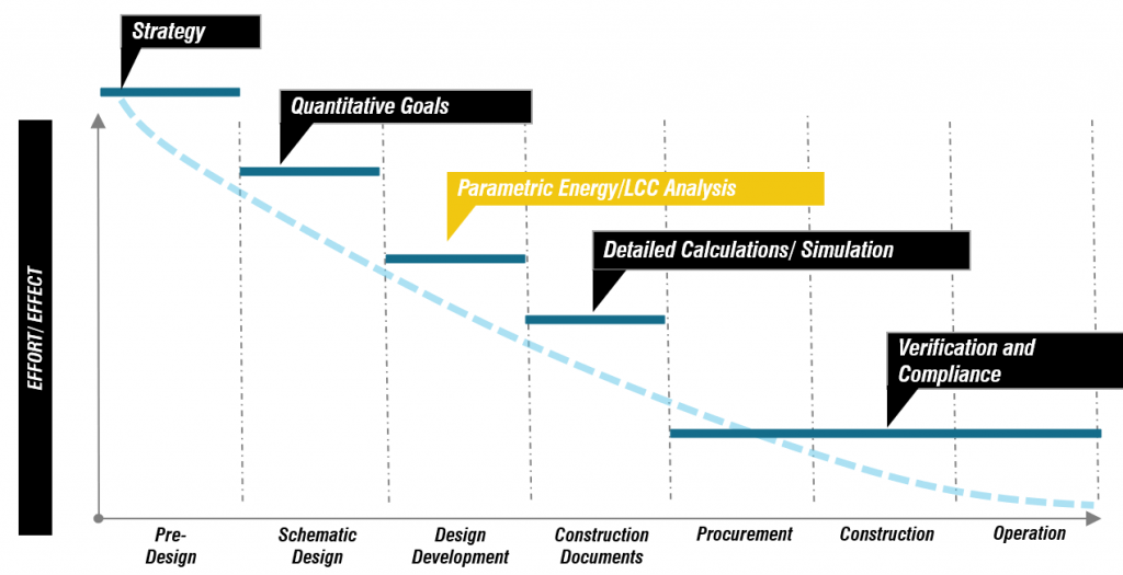 The Figure, is based on the MacLeamy curve (IDEAbuilder 2012). It shows how the effort and cost of design changes can be minimized at an earlier stage of the design process when the effect can be maximum. The aim is to facilitate the integration of building energy and life cycle cost calculations in the early stages of the building design. The MacLeamy’s curve is a well-known concept of how shifting decision making in building design early into the process leads to great benefits in building performance and cost. It is very costly to change the technical solution sets to reach nZEB at a late design stage. Hence, early-stage energy and life cycle cost analysis is vital for cost-effective nZEBs.