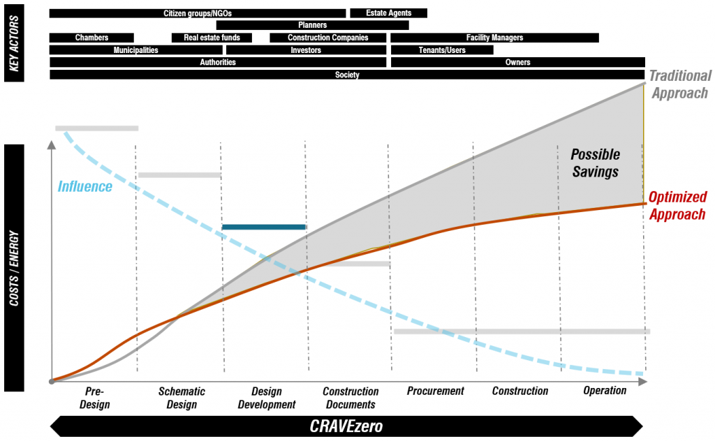 In addition to legal and urban boundaries, buildings are essentially defined by owners and investors. Technical quality and high comfort standards have to be achieved within project specific budget limitations. Architects and specialized planners typically translate the client’s ideas and wish into real plans and are responsible for the appropriate execution of the building project. Construction companies and craftsmen from numerous different disciplines are involved in constructing the building. There is a constant coordination process between the client, the planners and the contractors to prepare the construction of a building and if necessary, to react to changing conditions like costs, schedules, requests from the client, weather, etc. (Arnold 2005). The range of services provided to buildings in the urban context today has also changed over time and gained new aspects. Nearly zero energy buildings increasingly become active participants of our energy supply infrastructure and raise new challenges concerning the quality of planning, construction and operational phase of a building. This results in innovative energy concepts for both buildings and the districts. Innovations related to the realization of nZEBs arise in different life cycle phases of buildings and at different points of the value chain in the building industry. To reduce costs, accelerate processes and assure the quality of nZEBs the right decisions have to be taken at the ideal time within the overall process. In the early stage of building design, it is easy and inexpensive to make significant design changes to reach the best solution. Each design stage adds more and more details to the project, so it becomes more challenging and costly to make changes during the progression to further stages. Traditionally, during the design process for a building’s energy system, the architects send the initial building designs to engineers, who then test out a variety of energy system scenarios for a few weeks. During the time, when the engineers can come back with an analysis, the architects have often made significant design changes. This process can not only lead to less-efficient and more-expensive HVAC systems, renewable energy systems and envelope qualities, but usually leads to longer project timelines, unexpected construction issues, delays and budget overruns. The following process-framework developed in the CRAVEzero project makes it easier, faster and therefore cheaper to plan new nZEBs by helping to identify the most cost-effective and energy-efficient solutions and business models, all while reducing the risks of redesign, delay and budget overruns by optimizing overall processes.