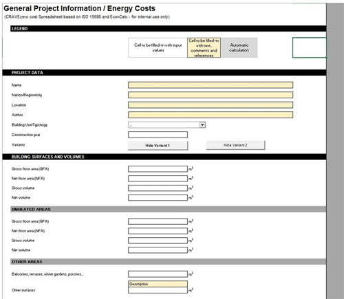 PROJECT INFORMATION - Part IIn this first input sheet general data about the analyzed building is collected, together with those boundary conditions needed for the LCC calculation. In the first section data about surfaces and volumes need to be provided. Following, data from the energy calculation is required. First, a reference area must be provided. The definition of “Treated floor area” comes from PHPP, the energy calculation tool used during the data collection campaign. If another tool is used for the energy calculation, the net floor area should be provided instead. The input parameters from “Average U-value opaque components” to “ PV installed capacity” are not essential for the LCC calculation, since they are used to calculate indicators. A section, which provides a check on the building construction costs, was also integrated to support the data collection. In this way it is possible to verify the correctness of data inserted in the “Construction cost” sheet comparing the sum of those values with the total cost (design + construction) inserted manually (if already available from a separate calculation). |