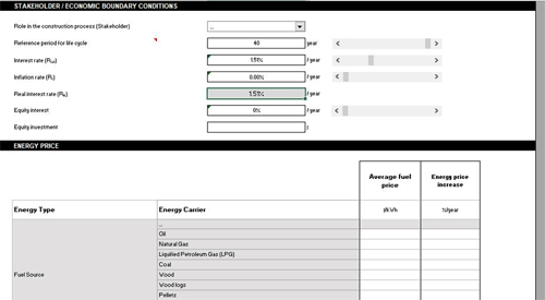 PROJECT INFORMATION - Part IIEconomic boundary conditions are collected in this section (Figure 5). This permits the calculation of actualized energy and maintenance costs over the building life span. Essential for the calculation are interest rate, the fuel prices and their average annual price increase.Finally, data about energy consumption (kWh/m2) and production in (kWh) must be provided, in order to determine operational cost. |