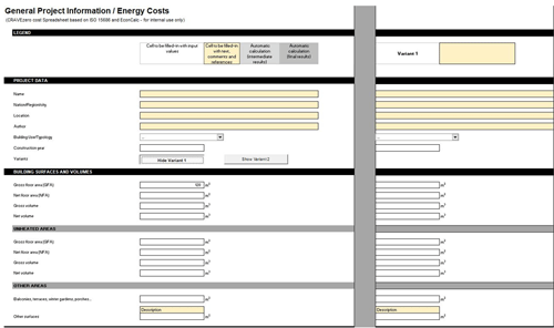 PROJECT INFORMATION - Part III (Variants)Variants can be investigated. Two buttons, also present in the other sheets, permit to display up to 2 variants. In this way different input values can be compared. |