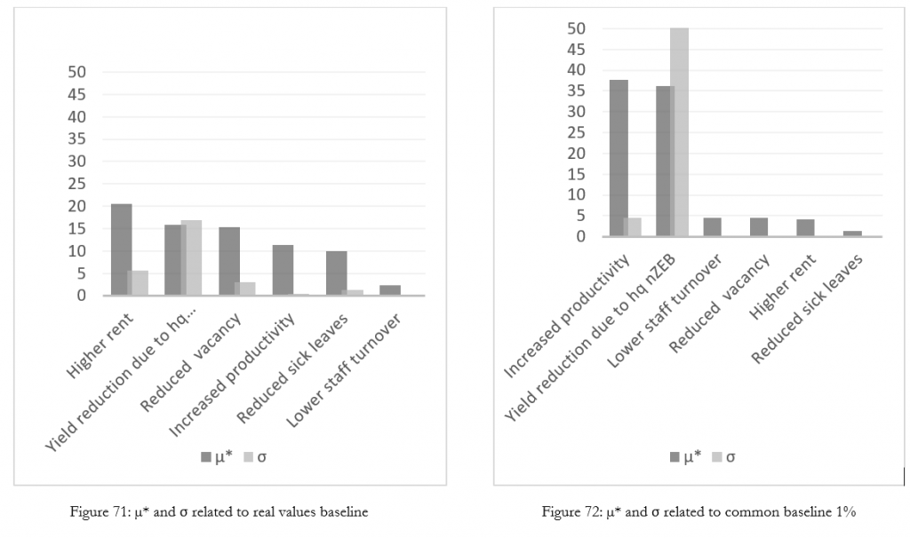 (Bleyl et al., 2017) state that in some cases a rent increase related to a green building can range from below 4 % up to 21 %. For this analysis a 5 % rent increase has been conservatively selected for the approach which takes into account baseline values from the literature. Nevertheless, in this case, this co-benefit showed the highest sensitivity index and µ*.