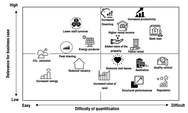The co-benefits have been analyzed in particular with regard to their influence on the payback time and profit over a period of 30 years for the case studies Aspern IQ and Väla Gard. Increased productivity of the employees due to higher building quality and comfort and a possible higher rental income due to a better building standard are the most important factors with regard to the payback time and profit. But also the other co-benefits, which were examined here in more detail, have a significant influence.