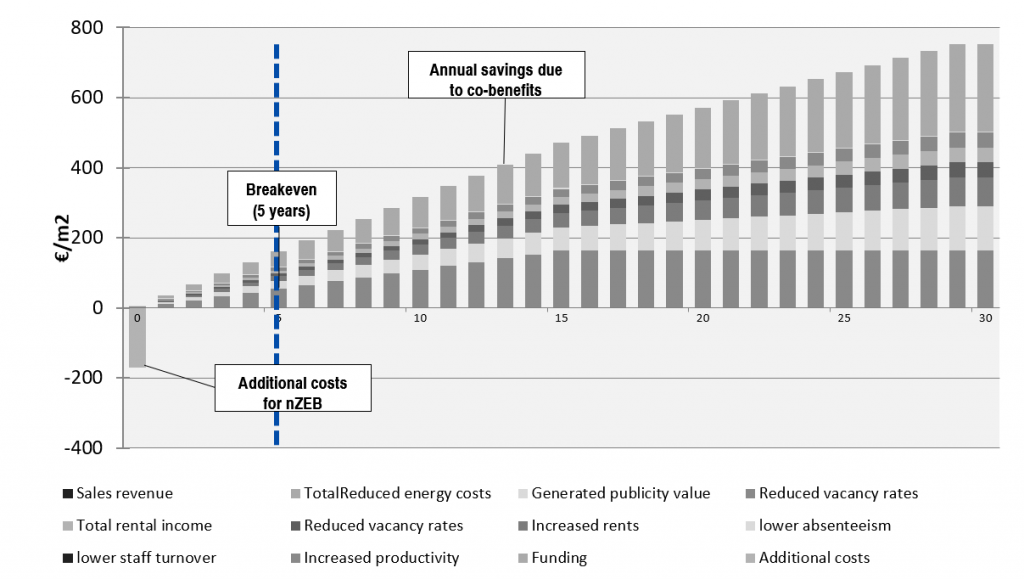 Based on this building data, the different co-benefits were considered in Aspern IQ. Calculation results with and without the consideration of co-benefits clearly show the influence of the individual parameters on the overall cost curve over 30 years and especially the breakeven of the additional nZEB investments as can be seen in Figure 69. The following list shows the applied co-benefits.