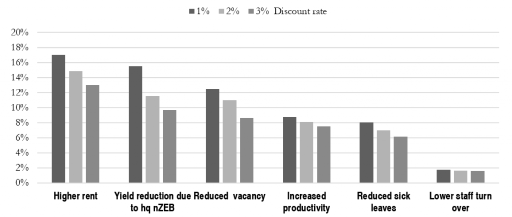 In the first approach, where real values for the baselines are adopted, the three most influencing co-benefits are “higher rent”, “yield reduction due to a high quality nZEB” and “reduced vacancy”. However, quite different outcomes are obtained if the second approach is considered: the most influencing values by far are “yield reduction due to hq nZEB” and “increased productivity”.